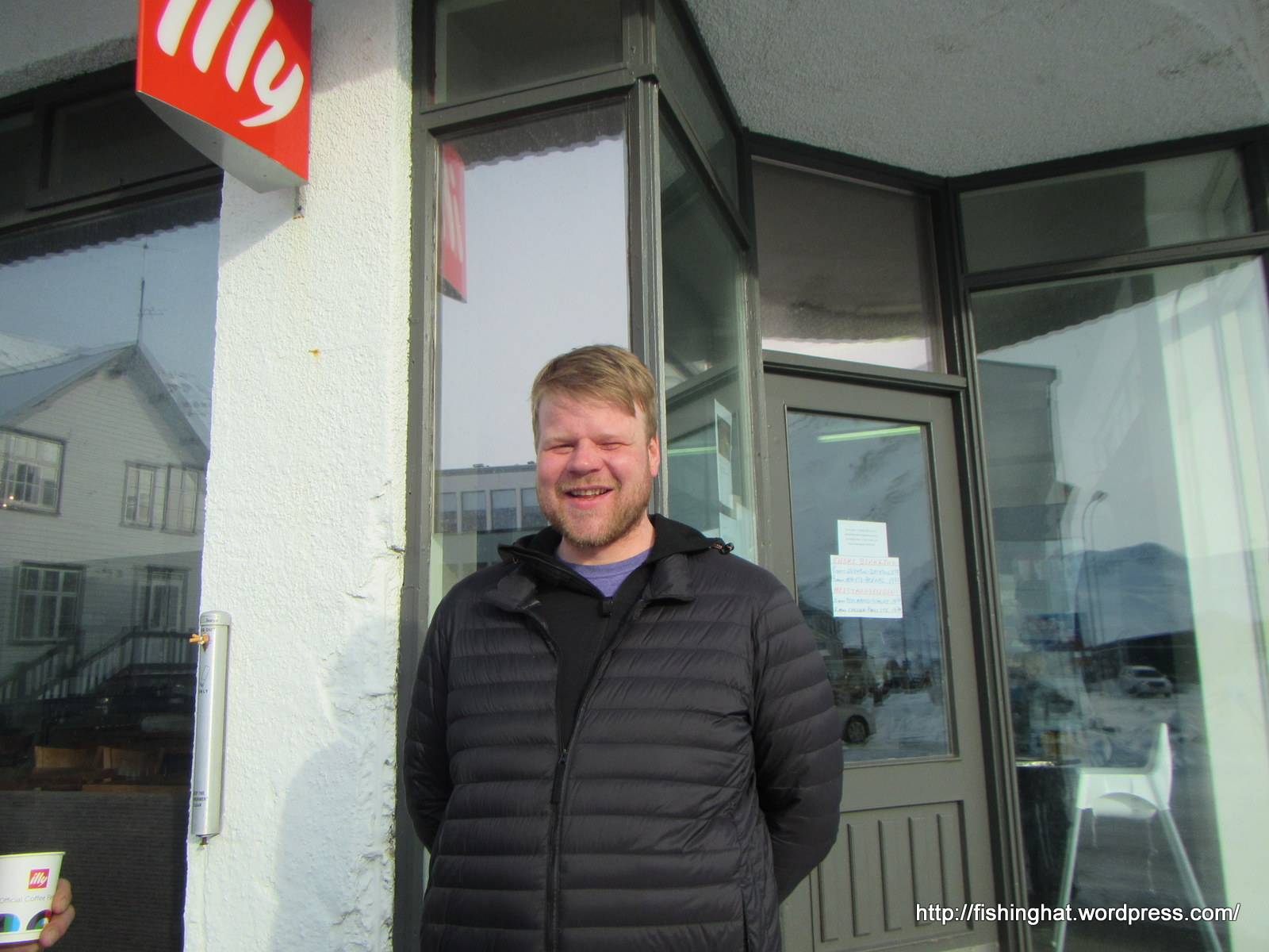 10. mars. Arnar minn fyrir framan bakaríið.