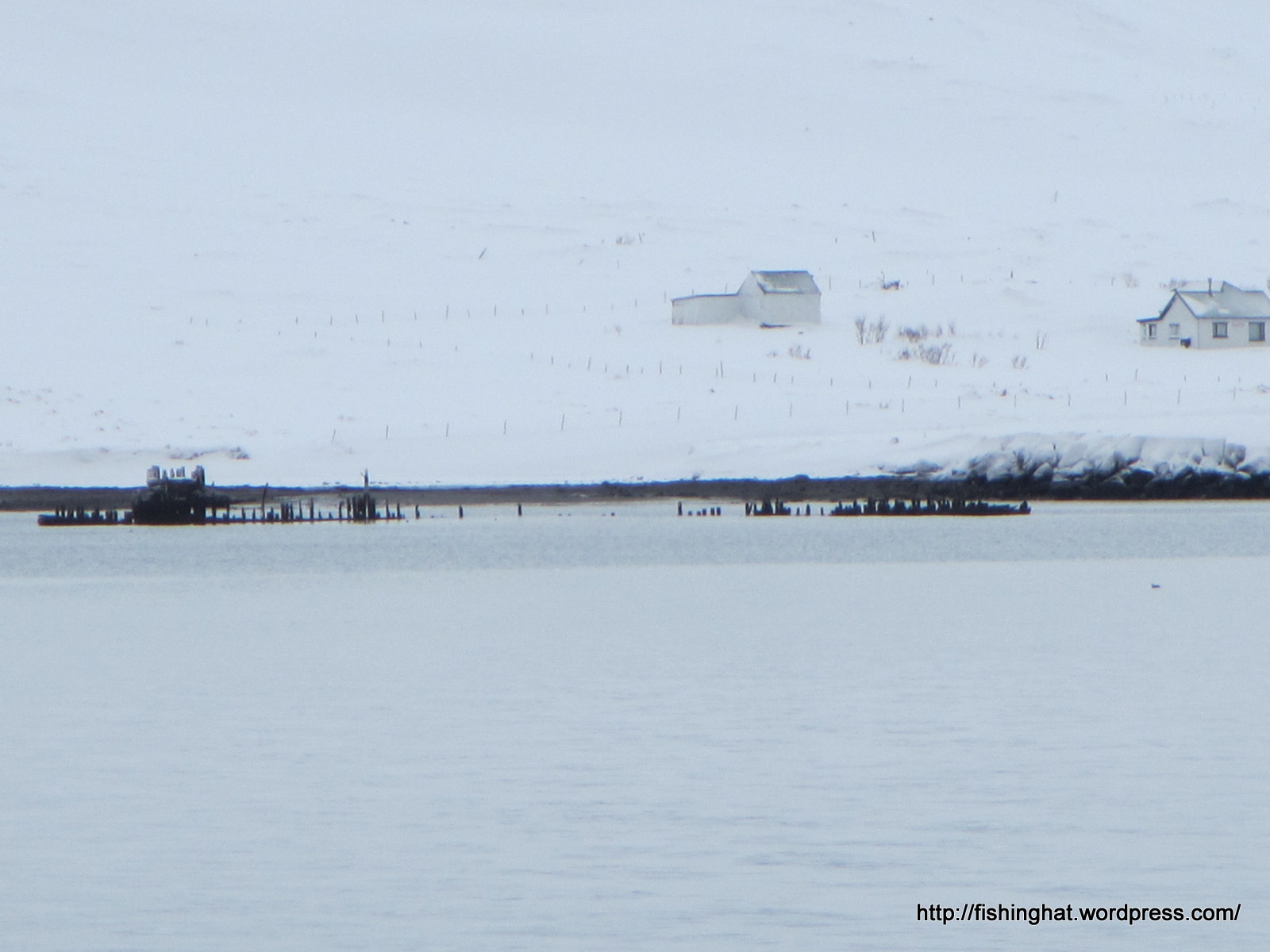 4. mars. Leifarnar af Skoger eru eins og beinagrind uppúr sjónum á fjörunni.